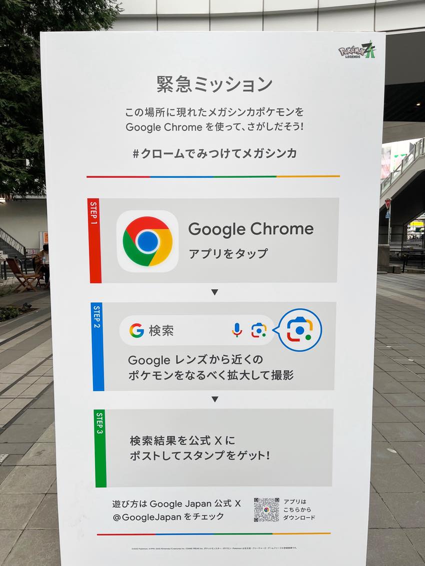 今回のイベントは、『Pokémon LEGENDS Z-A』と連動した体験型企画。Google Chromeの「レンズ検索」を使って、街中に潜むメガシンカポケモンを調査するというものなんです。