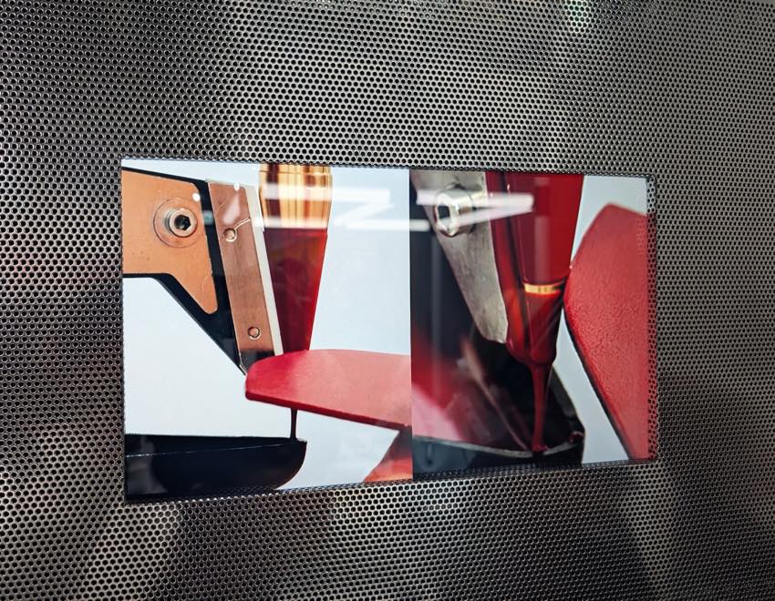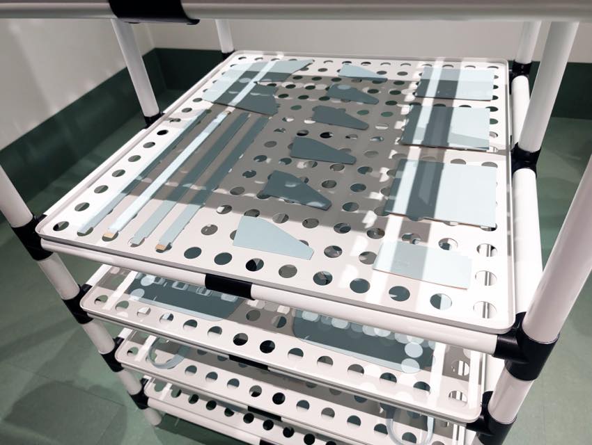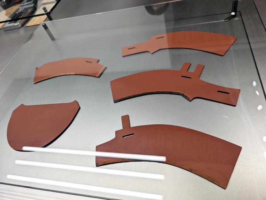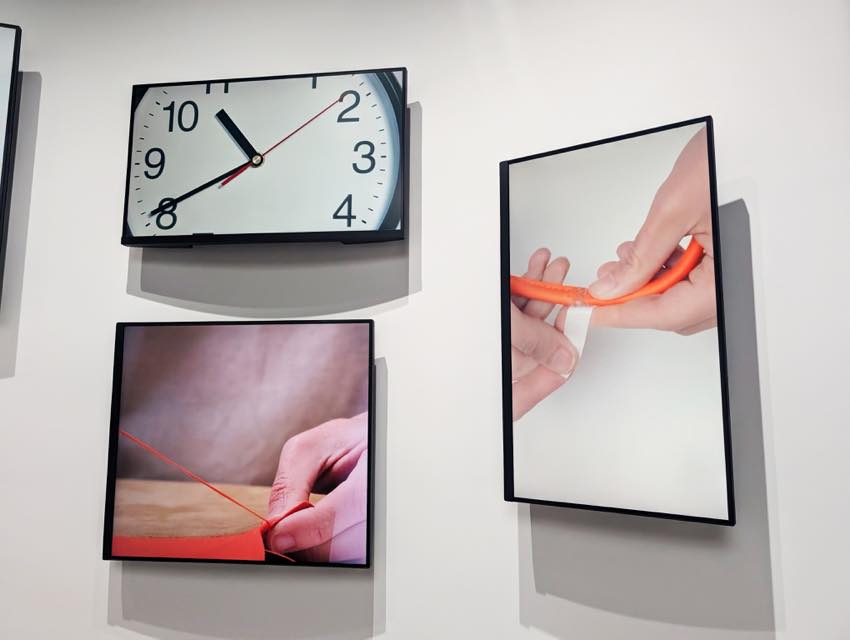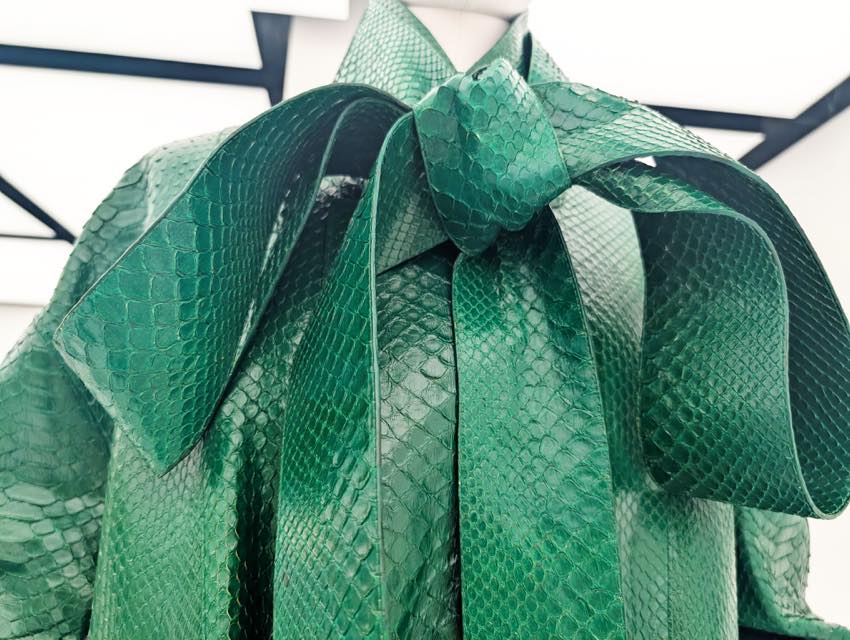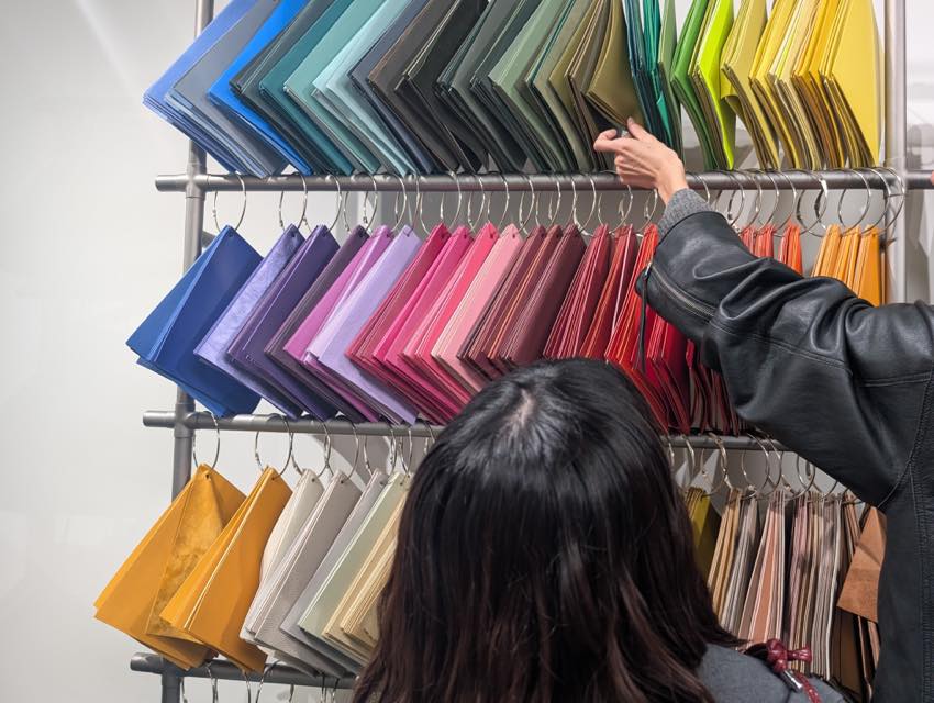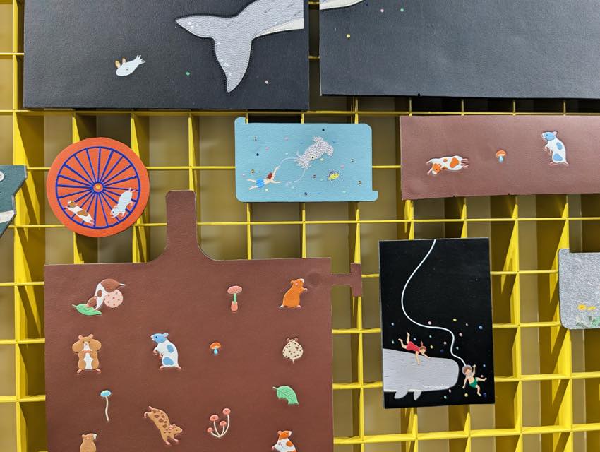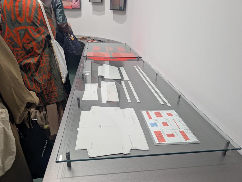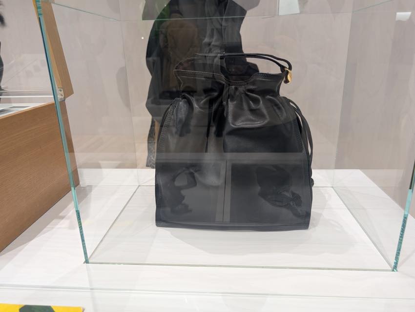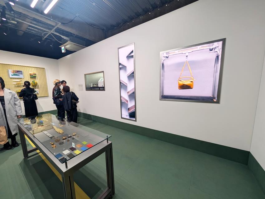 バッグの製作工程をアトリエ形式で紹介。裁断から組み立てまでの流れを追体験でき、職人の手仕事の精密さや、何百時間もかけられた試作の過程をリアルに感じられます。手に触れたくなるほどの細やかさでした。