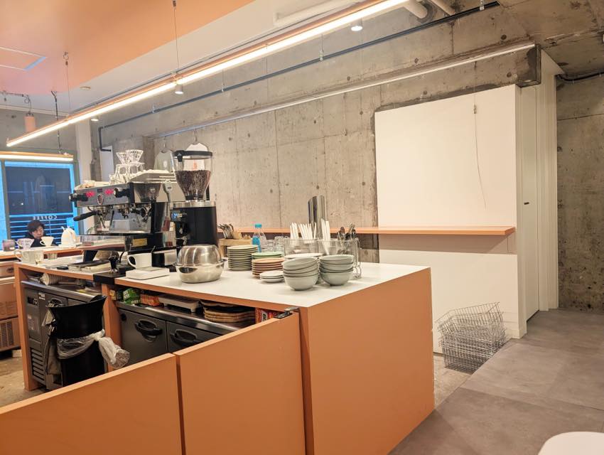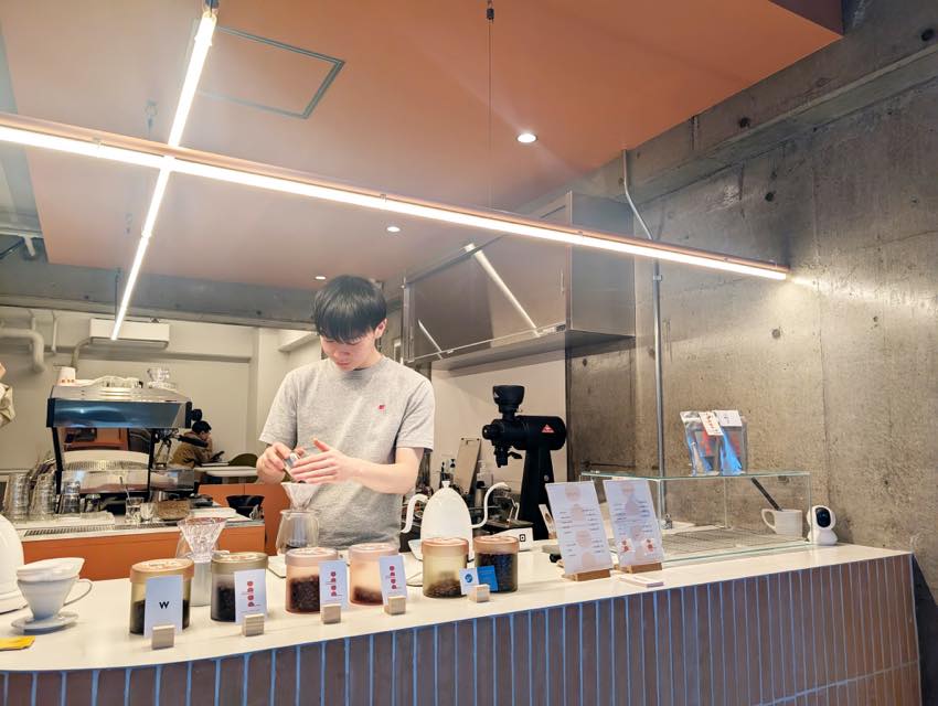 内装はミントグリーンを基調に、アクセントのオレンジが映えてとても可愛らしい雰囲気。カウンター席に加えて奥にはテーブル席もいくつかあり、友人とゆっくり過ごすのにも、一人で静かにコーヒーを楽しむのにもぴったりです。