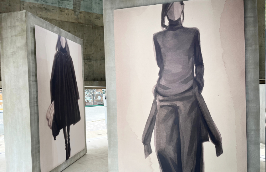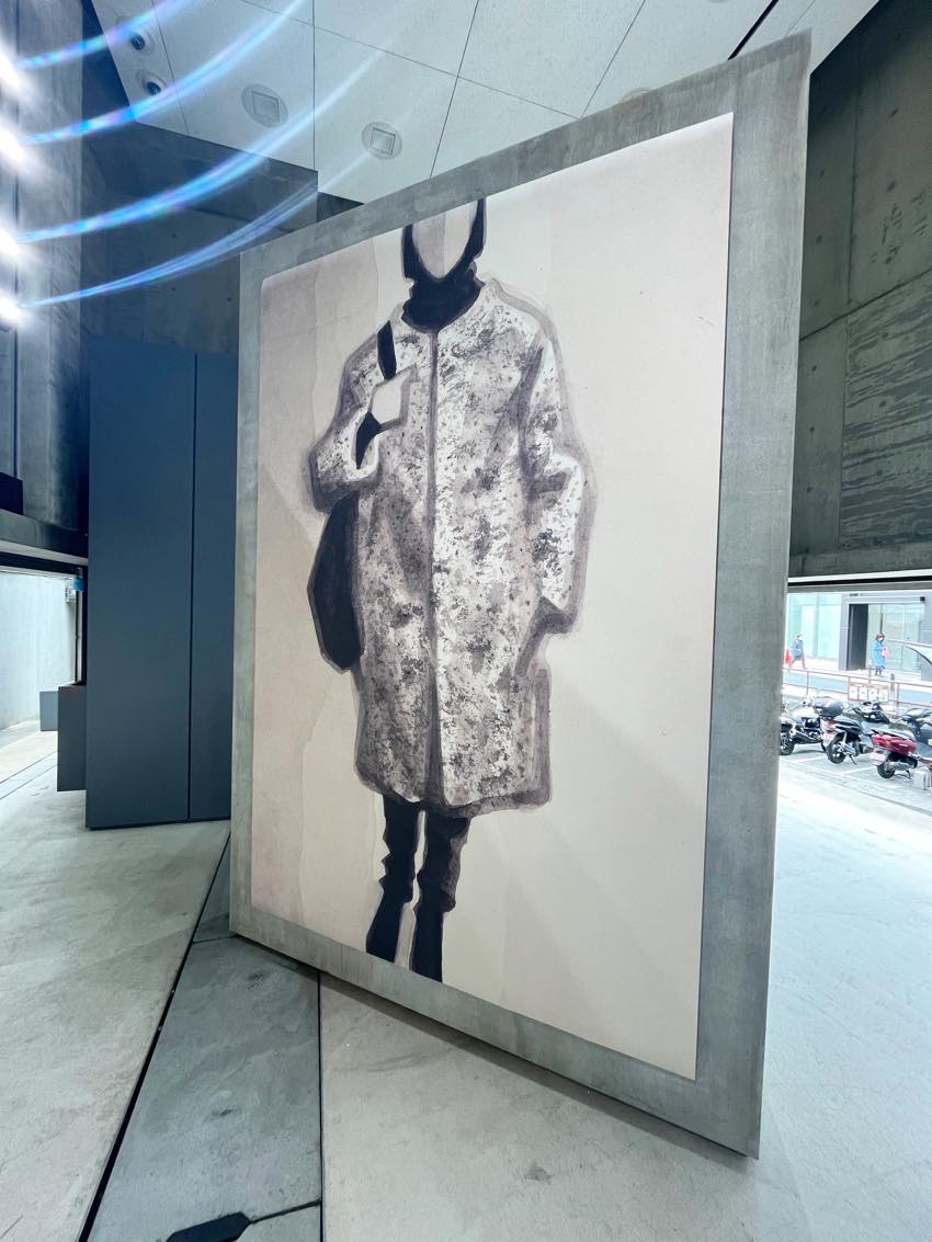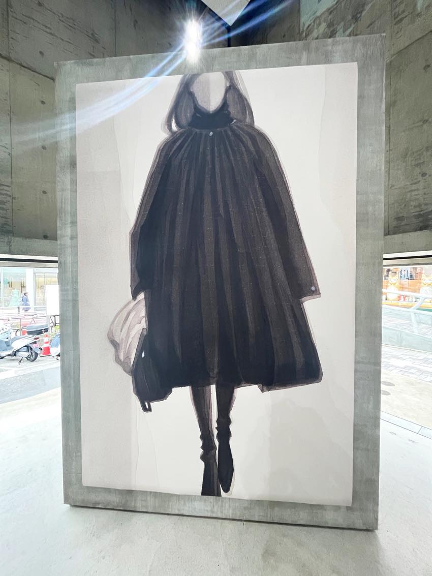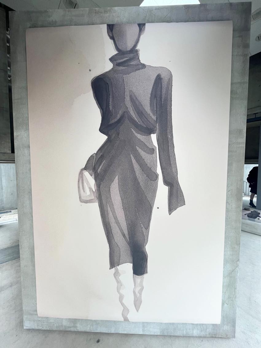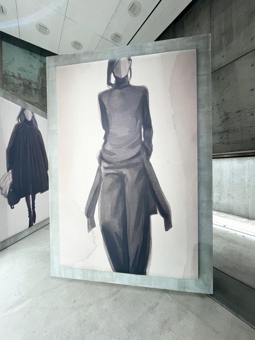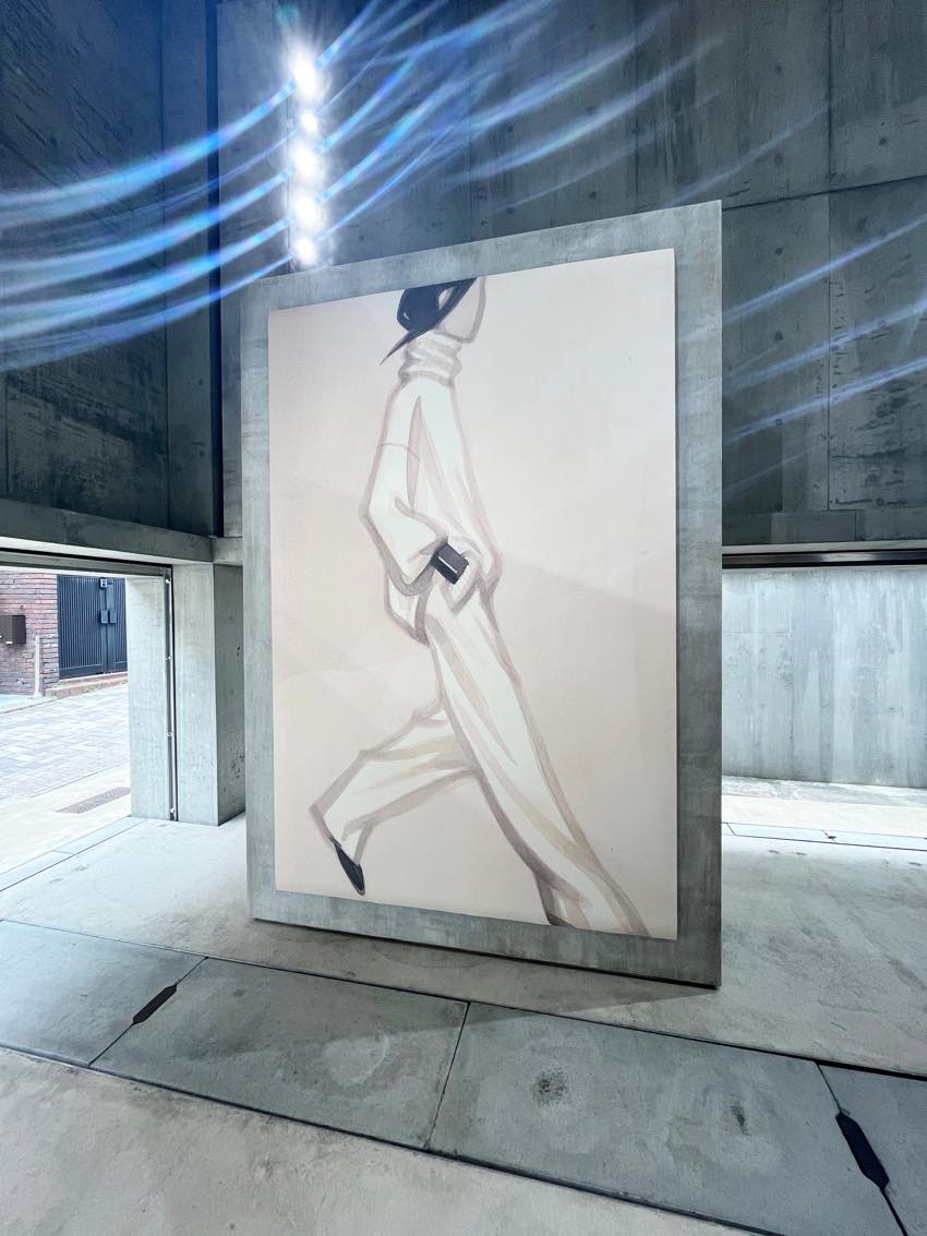 TOTEMEの2025年秋冬コレクションから着想を得たというこれらの作品は、余計なものを削ぎ落としたミニマルなラインが本当に美しく、服のシルエットが最も純粋な形で表現されていました。無機質なコンクリートの質感と、繊細な水彩画のコントラストが絶妙で、ブランドの哲学である「精度と抑制」を肌で感じることができました。